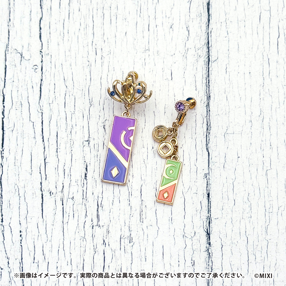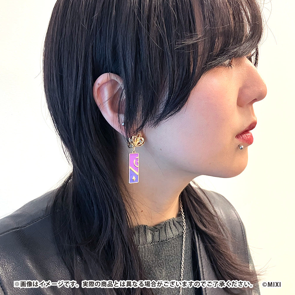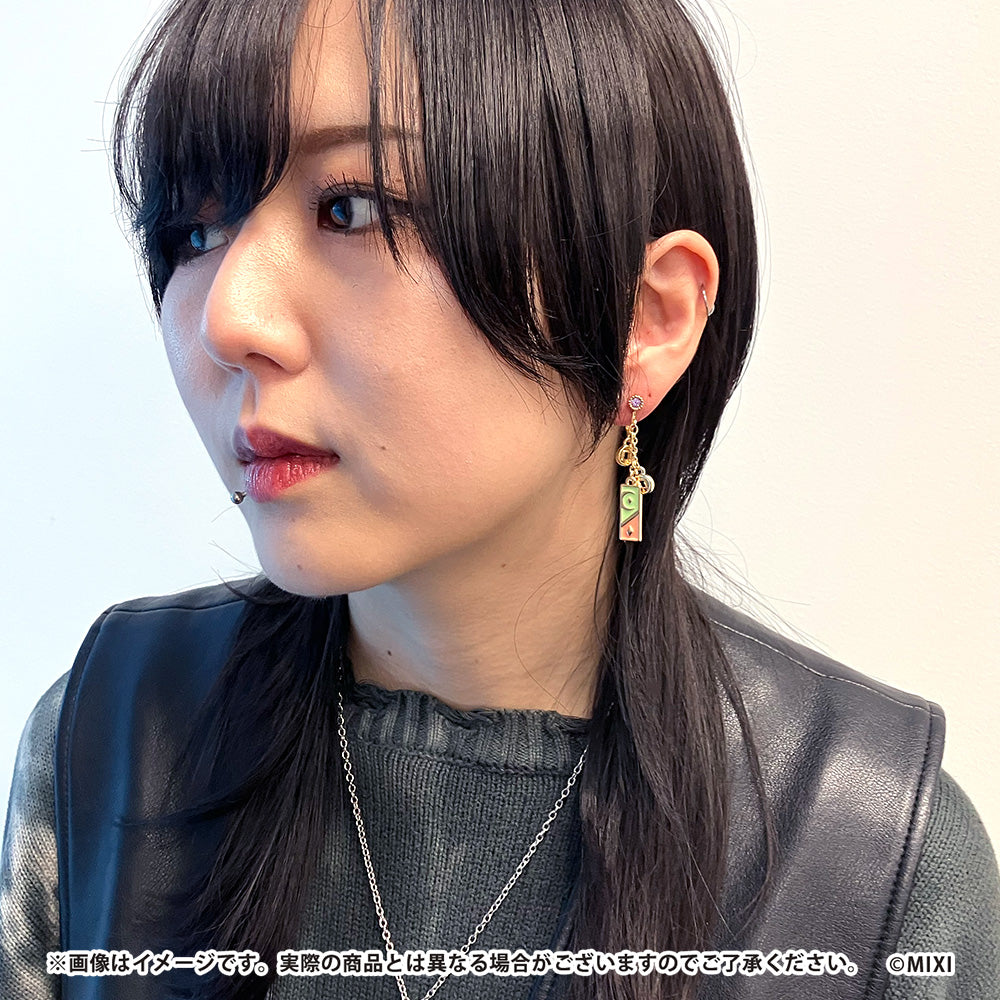 キャラクターイメージのガラスストーンやモチーフ要素(彼岸花の髪飾り/札型のイヤリング/六文銭/腰の大きな札の装飾/服の模様)を入れ込んだオリジナルイヤリングです。