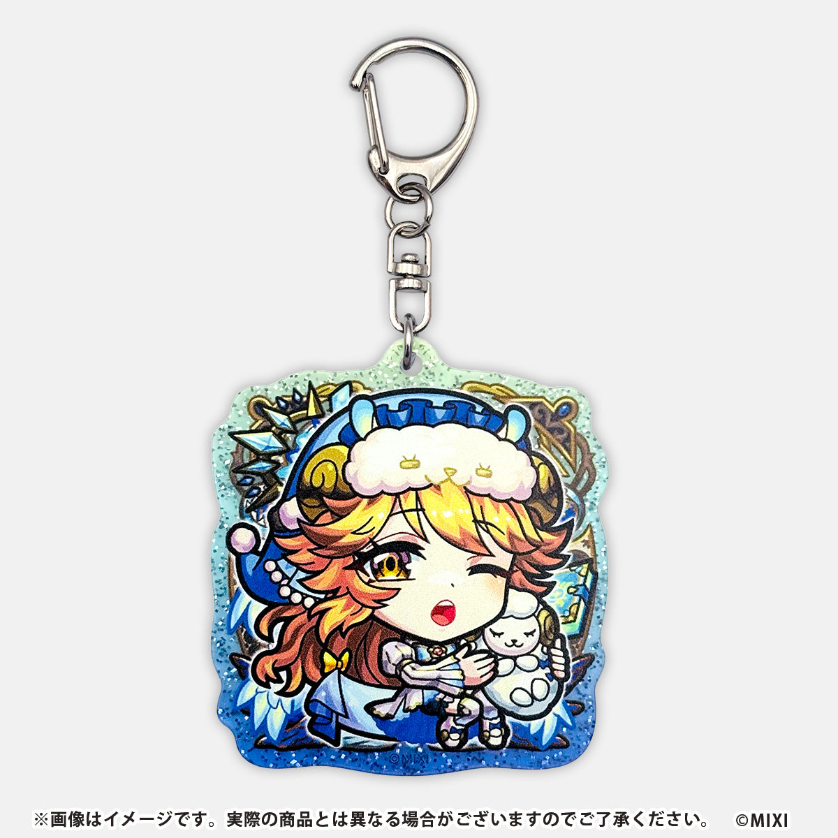 銀色のラメを散りばめたアクリルを使用し、透明感ときらめきが楽しめるメタリックアクリルキーホルダー。獣神化・改の「ボール絵」をデザインした”初”のグッズです。