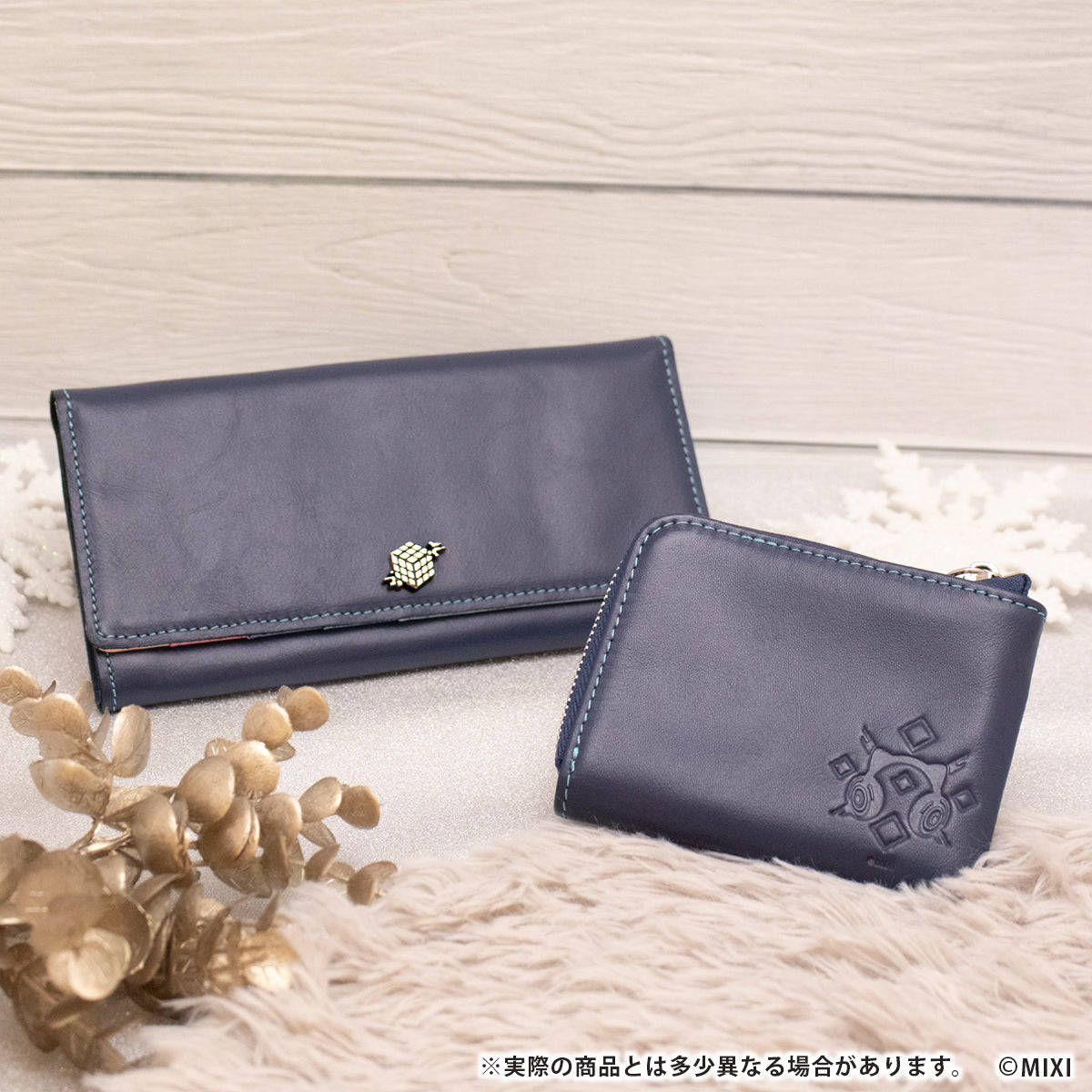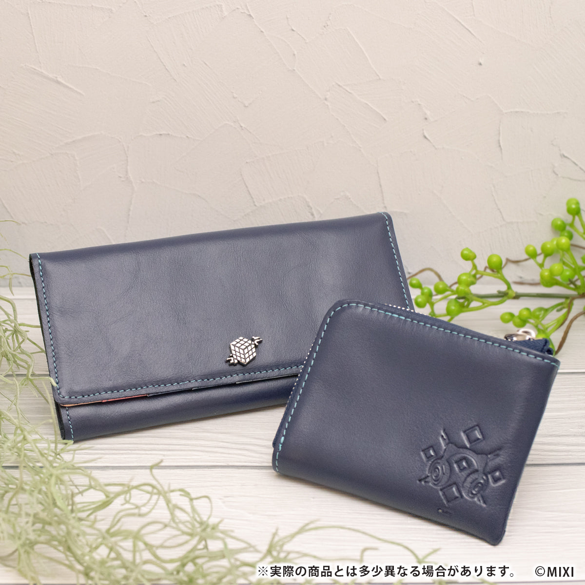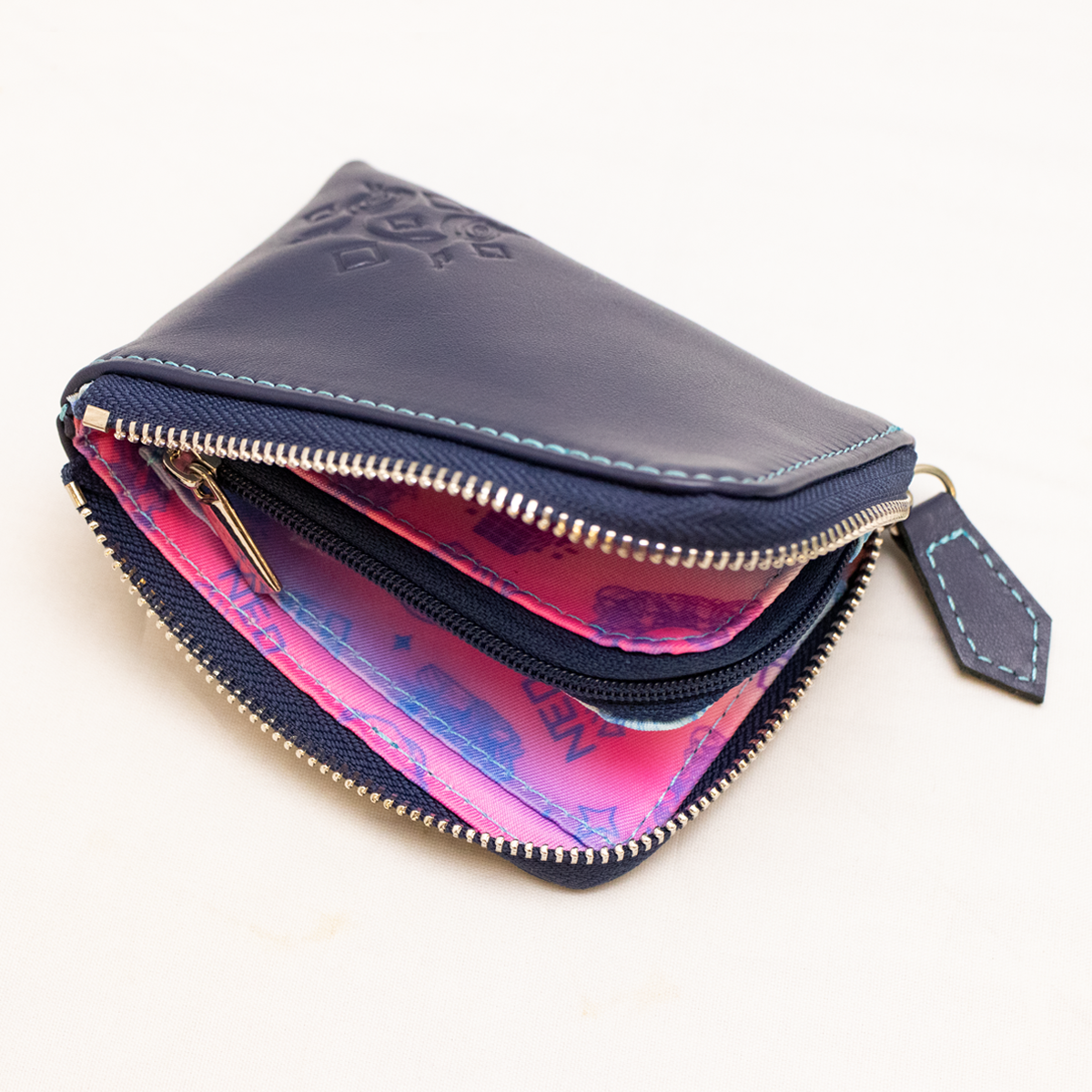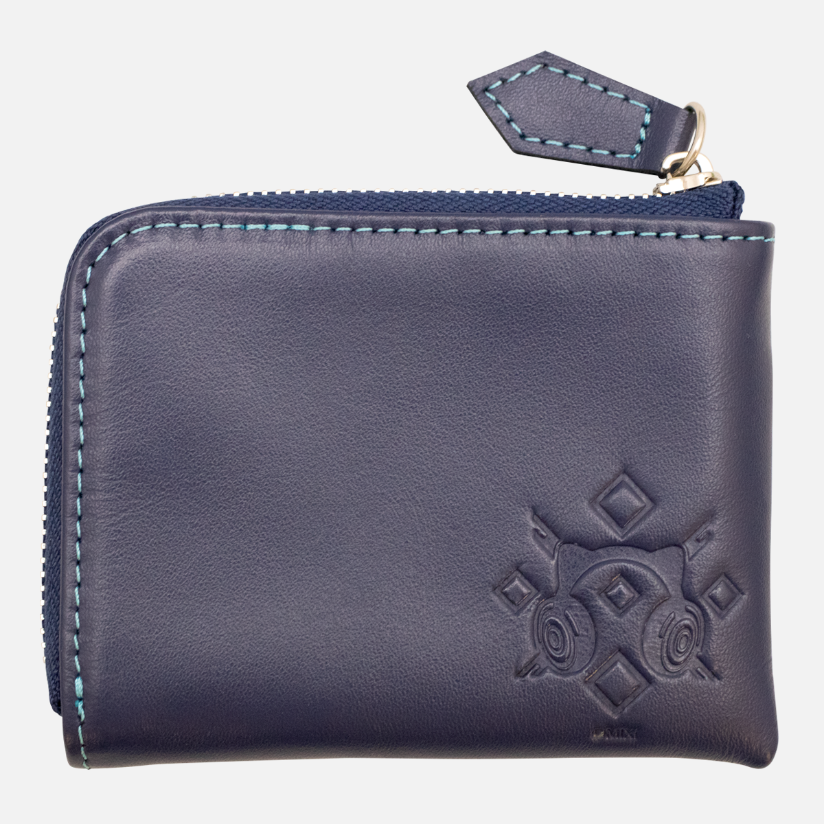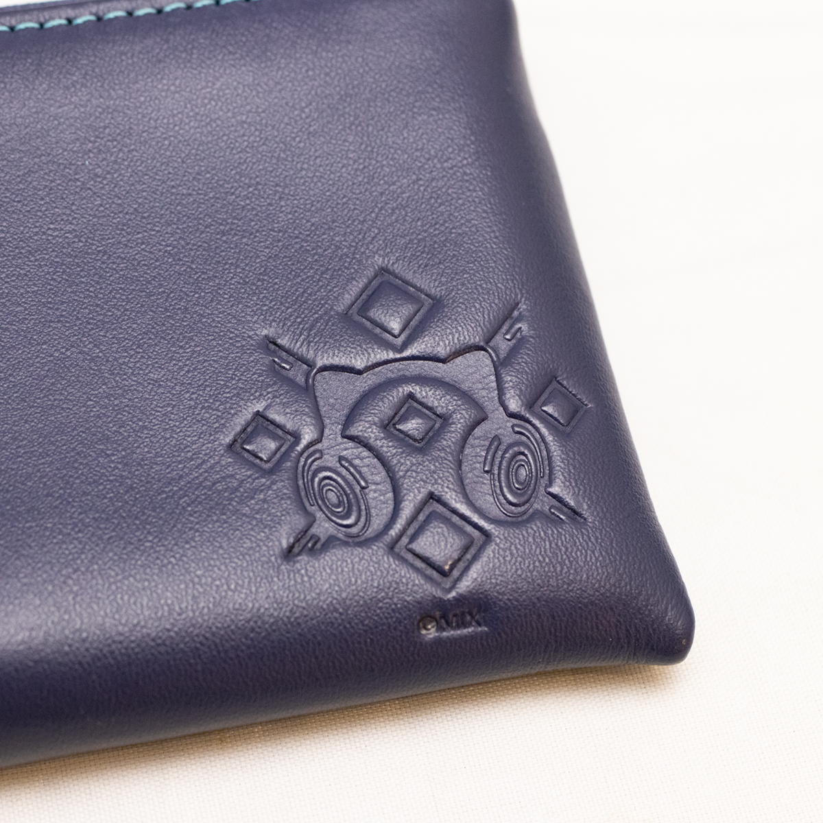 コインケース本体は服の深い紺色を再現した本革を使用。外側にはモチーフがさりげなく型押しされています。