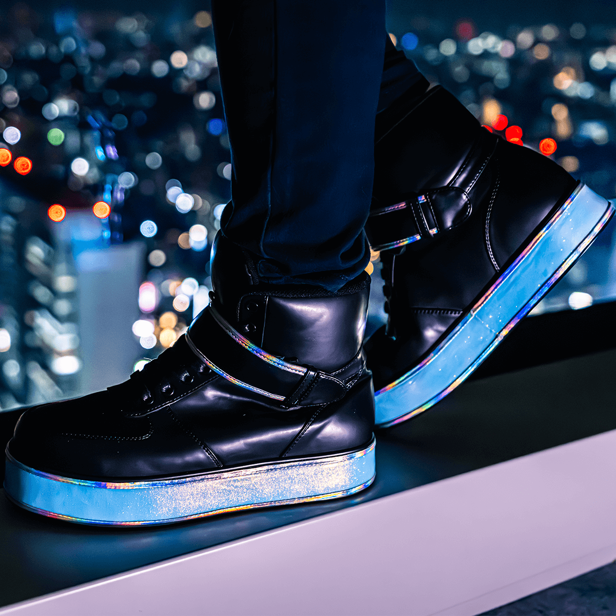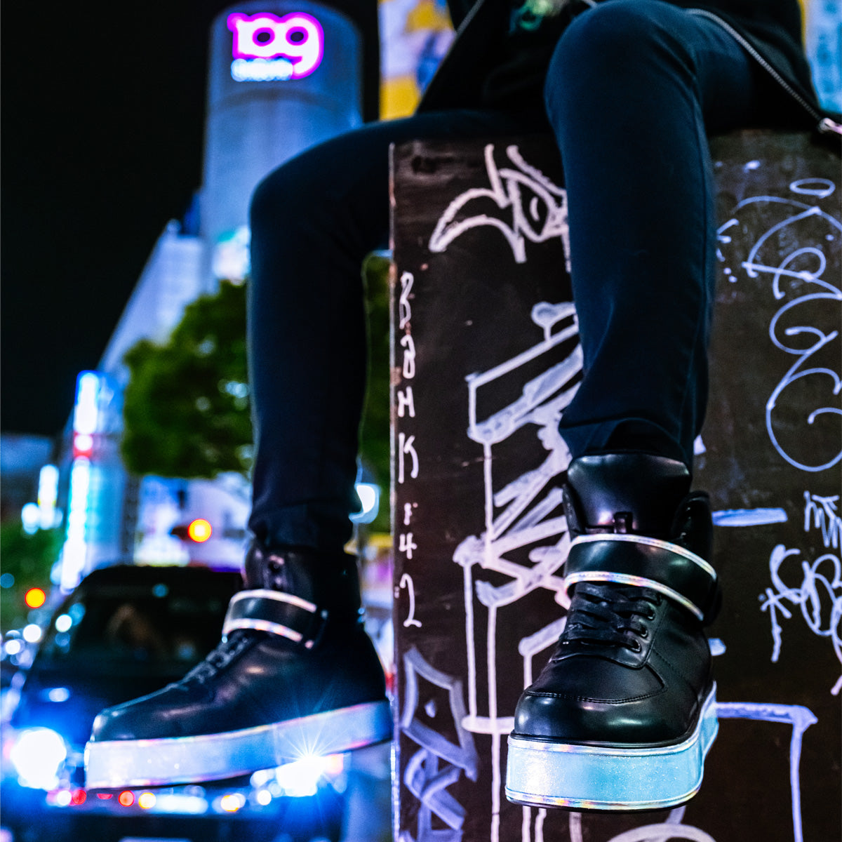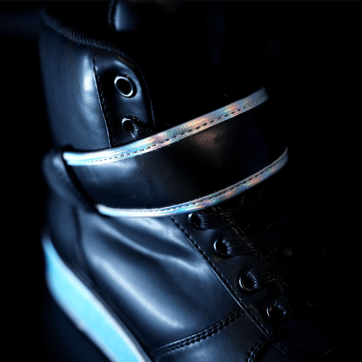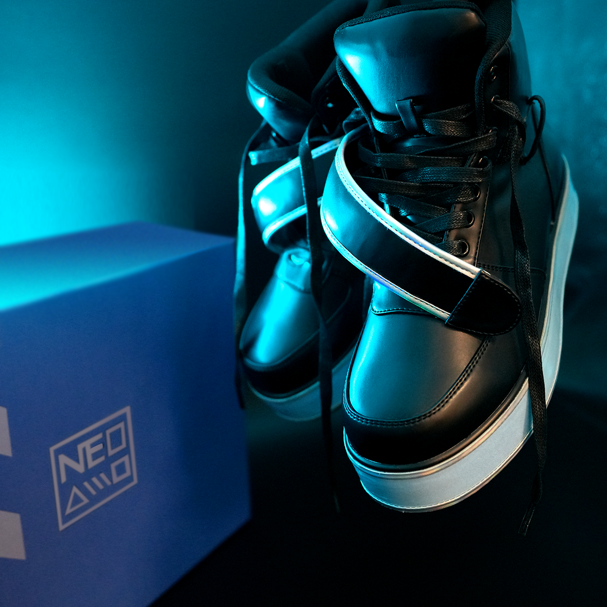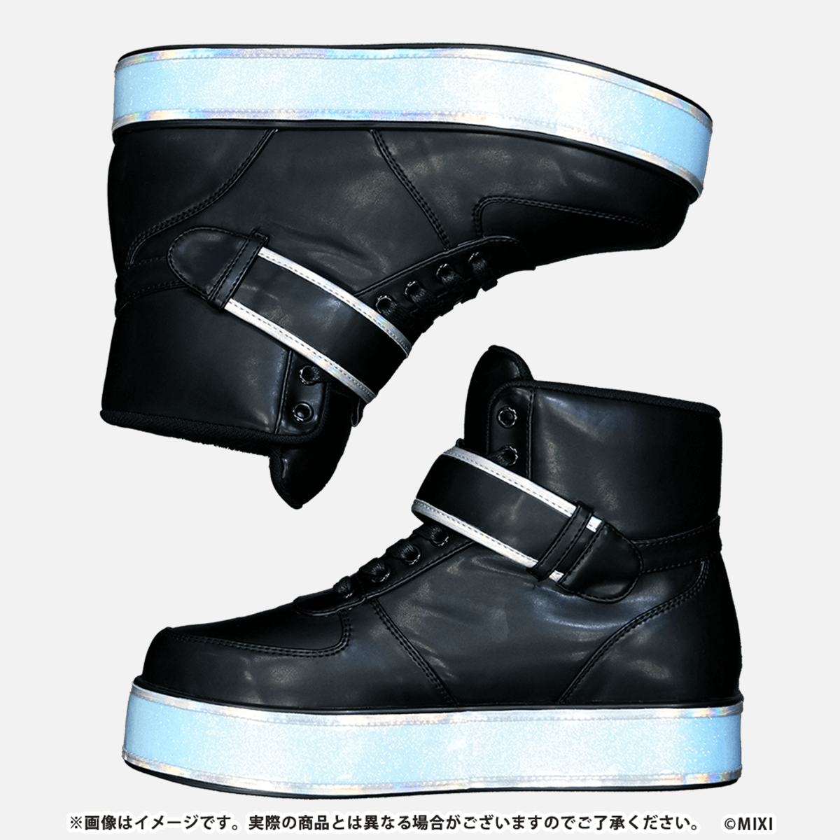 オリジナル専用BOXに入ったスニーカーは、ネオが着用しているものと同様ハイカットでソール側面やベルト部分にはオーロラ加工が施されています。